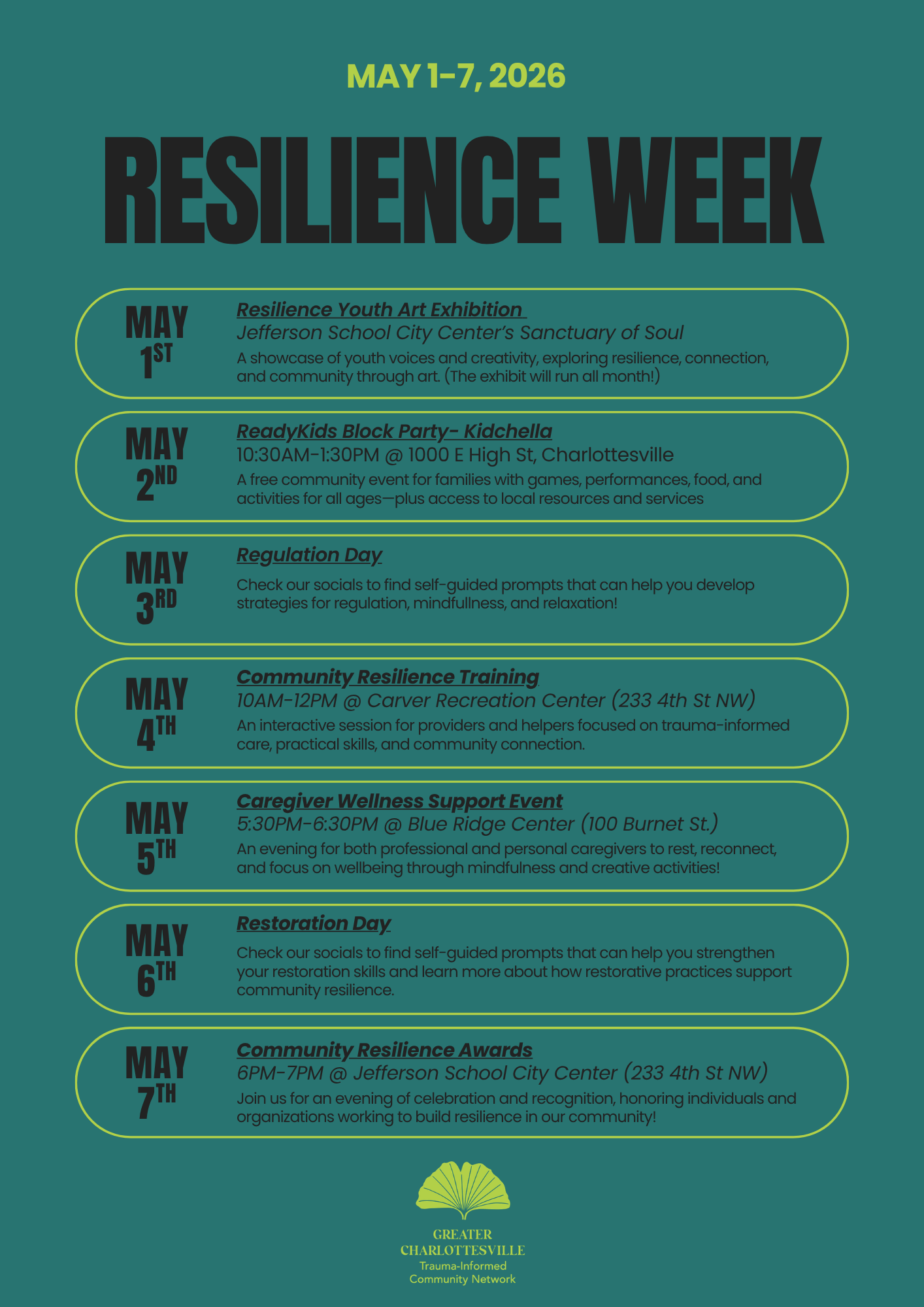 Resilience Week is an opportunity to pause, connect, and invest in ourselves and our community. Whether you attend an event, participate in a self-guided activity, or simply take time to reflect, every step contributes to a stronger, more connected community.